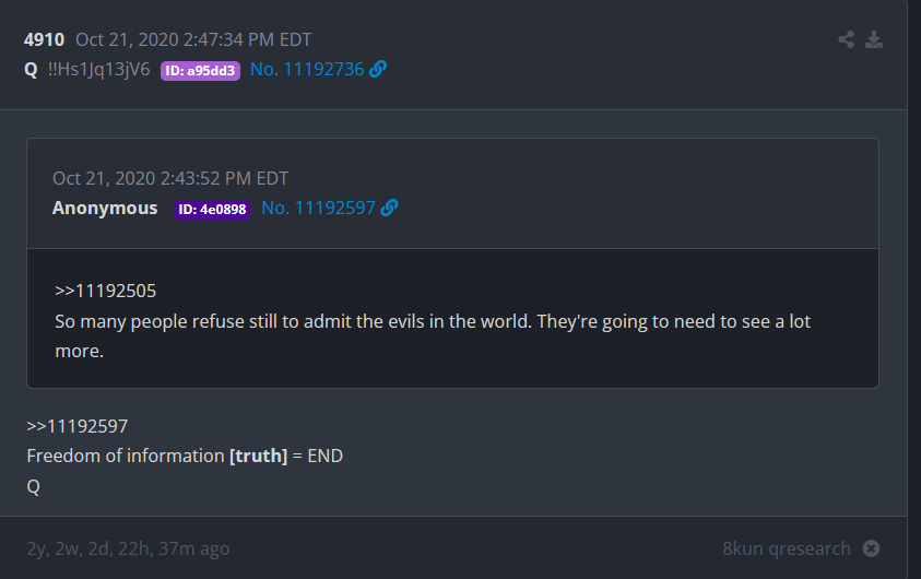 Ultimately, this war, though multi-faceted, has one core principle at its heart. Should humanity be free or should a tiny group be allowed to enslave the rest? We are lucky to have been afforded a glimpse of the future that awaits if the enemy is unchecked. Their dystopian vision is easy enough to flesh out with a little research. It ain’t pretty. Centralised control of everything: money, energy, information. A social credit system. All devices hooked up to the grid, the Internet of Things. People too, the Internet of Bodies. All under the enemy’s control.